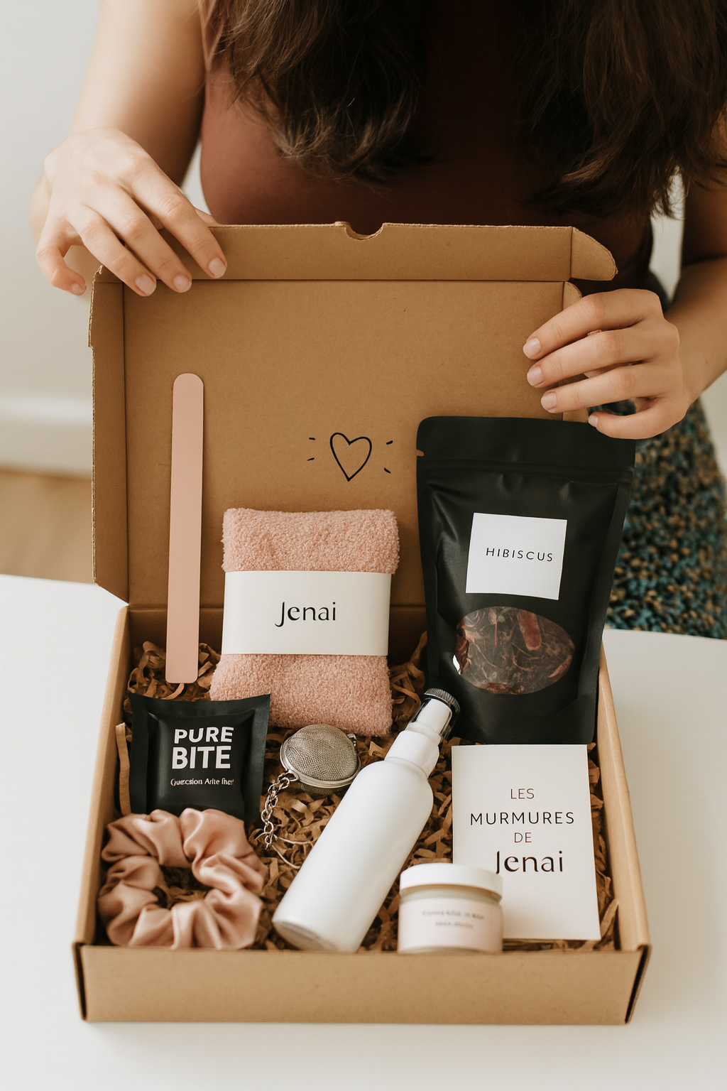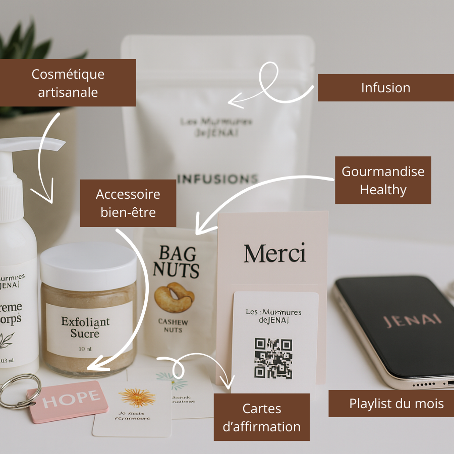 Chaque coffret contient des créations de soins maison , un mélange de plantes nourrissantes ou un boost nutritionnel, un accessoire bien-être, un article lifestyle et le livret Ma Pause Sacrée avec rituels et pistes de réflexion, ainsi que votre carte d'affirmation Murmures de JĒNAI . À partir de 3 mois d'abonnement, vous aurez également accès à des expériences audio guidées.